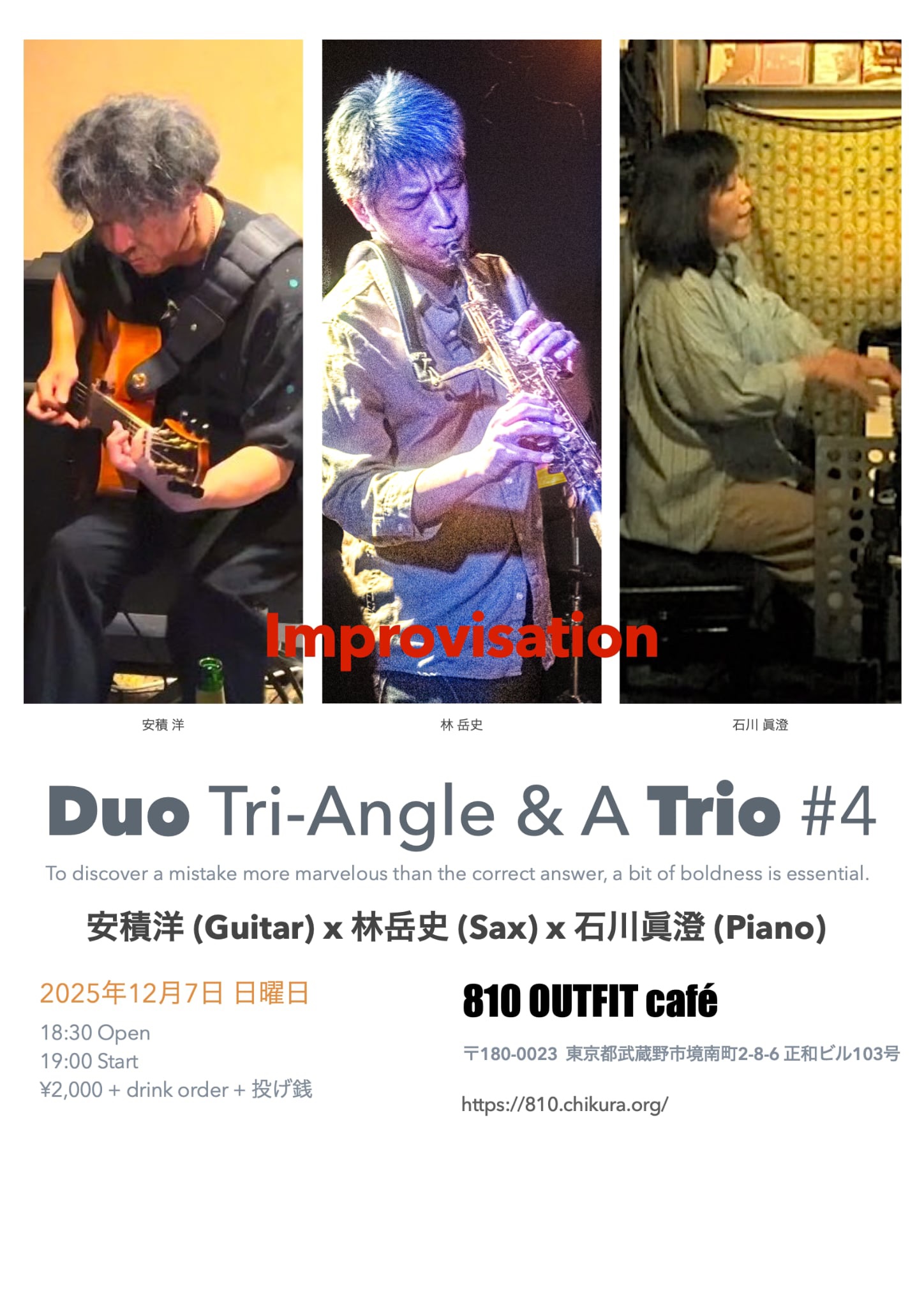 | 12/7 | 土 | ◯ | 安積企画 Duo Tri-Angle & A Trio #4 | ◯ | ◯ | |||