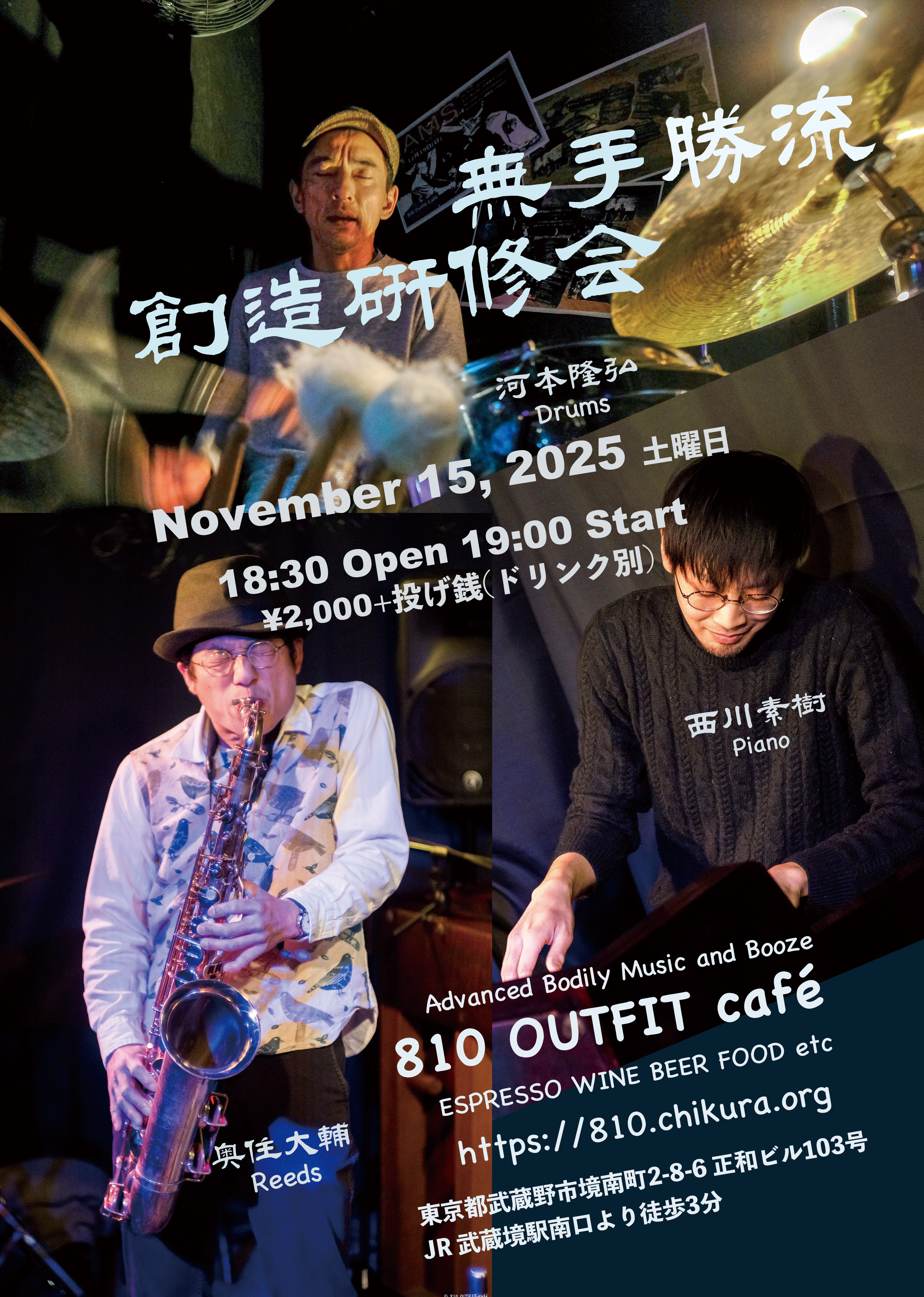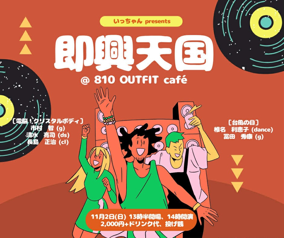 11/2 | 日 | ◯ | 市村智(bs,g)+長島正治(cl)+清水亮司(ds) / 富田秀康(g)+椎名利惠子(dance) | ◯ | ◯ | ||
